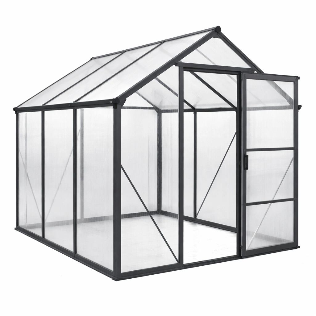 Este invernadero consta de una estructura de aluminio y paneles de policarbonato transparente de 4 mm de grosor. La estructura es negra, con un techo inclinado que permite una alta transmisión de luz. Resistente a la intemperie.